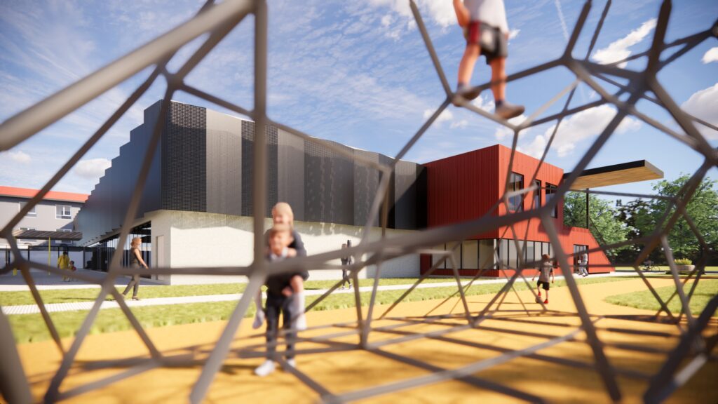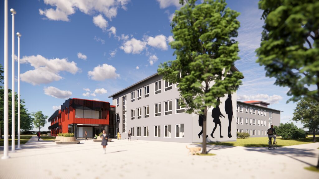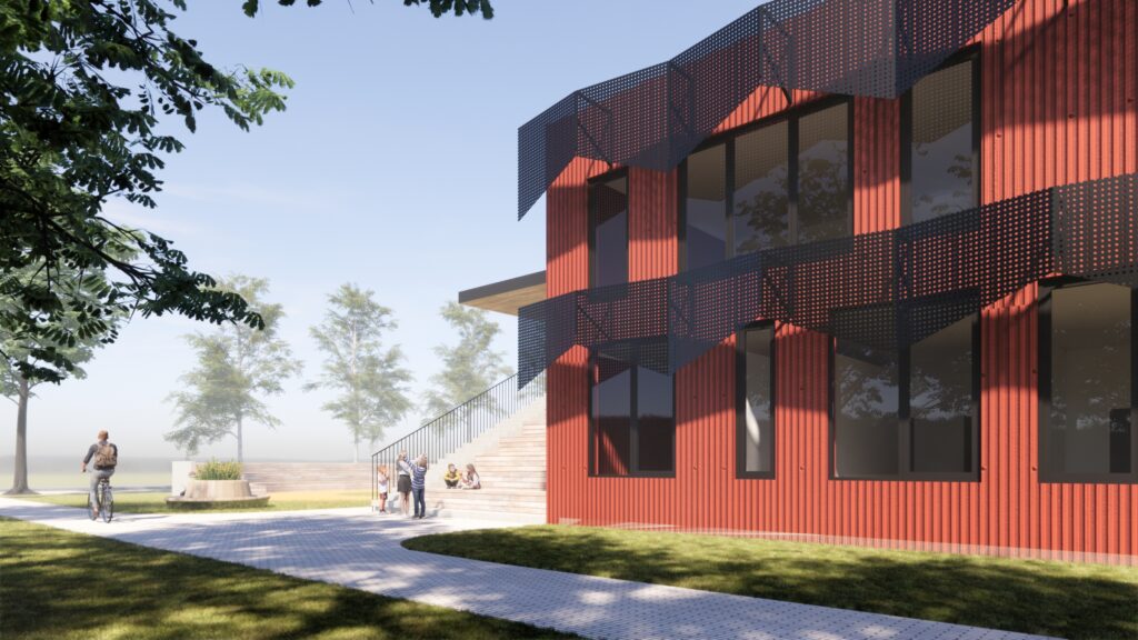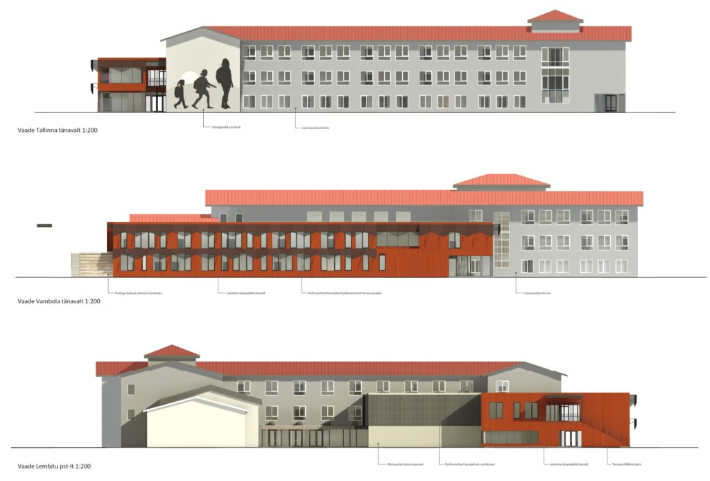 Juurdeehituse maht lähtub akende- ja fassaadijaotuses olemasoleva “uue osa” fassaadidest ning sobitub olemasoleva hoonega. Algklasside osa fassaadid kaetakse laineliste sügavpunast tooni metallkassettidega, sest praegune puidust ribistik on amortiseerunud, ning selle all olev betoonsein on kruviaukudest visuaalselt kahjustatud. Samuti seob uus fassaadikate juurdeehituse ja olemasoleva osa uueks värske ilmega tervikuks.