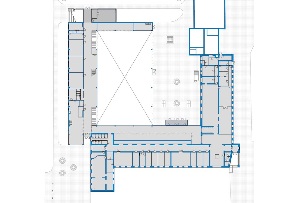 Hoone mahud moodustavad ruudu, mille keskele jääb sisehoov. Sisehoovipoolne sissepääs on võetud aktiivsemalt kasutusele ning hetkel üsna kasutuseta sisehoov on täiendatud väikevormide, konteinerhaljastuse ja uue suure tuulekojaga, mis tagab sissepääsu otse garderoobi.